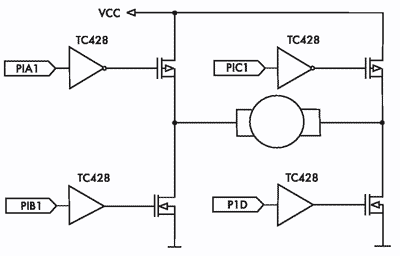 Модуль ЕССР имеет опции для управления коллекторными двигателями постоянного тока. На рис. 17 приведена схема подключения мостовой схемы управления двигателем. Выводы модуля ЕССР P1A...P1D могут работать в режиме управления мостовой схемой и задавать скорость и направление вращения. Для примера, изображенного на рис. 17, модуль ЕССР конфигурируется так: P1A, P1C активный уровень "1"; P1B, P1D активный уровень "1" (CCP1CON<3:1>). Это сделано для того, чтобы MOSFET-драйверы (ТС428) открывали выходные ключи. В таблице указана связь между режимами работы двигателя и выходами ШИМ.