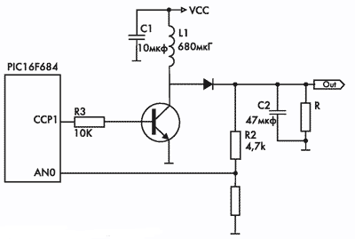 Скважность ШИМ вычисляется контроллером по закону ПИД, что позволяет поддерживать выходное напряжение при изменении нагрузки. Более подробно данный метод описан в примере AN258 "Low Cost USB Microcontroller Programmer" на сайте Microchip.