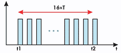 - вычитаем сохраненное время (t1) из захваченного значения времени (t2) и сохраняем результат 16 периодов (168Т);