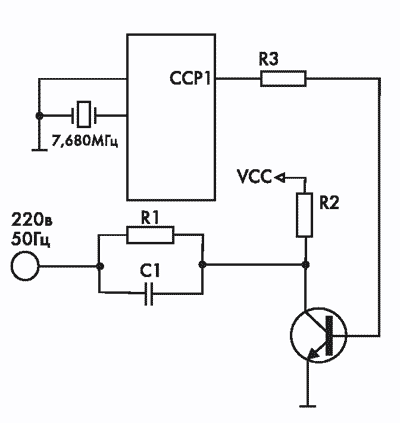 Для передачи информации по электросетям, например, передачи данных внутри квартиры по силовой проводке 220 В, часто используется протокол Х-10. На основную частоту (50/60 Гц) накладывается модулированный сигнал более высокой частоты (120 кГц). Для получения такой частоты в контроллере можно применять модуль ССР в режиме ШИМ. На рис. 6 показана реализация передатчика.