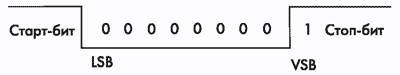 В тех контроллерах, где нет аппаратного модуля USART, модуль ССР можно использовать в режиме захвата для автоматического определения скорости связи и затем перенастроить в режим сравнения для формирования или приема данных через RS-232. Для работы алгоритма автоопределения скорости необходим калибровочный байт, с которого начинается передача данных от одного устройства к другому. Один из возможных калибровочных символов изображен на рис. 21. Известные временные параметры калибровочного символа позволяют принимающему устройству определить и настроить скорость передачи интерфейса RS-232.