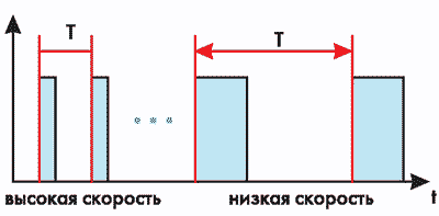 Такой датчик выдает один или несколько импульсов на один оборот объекта. На рис. 7 показаны временные диаграммы при разных скоростях вращения. При увеличении скорости вращения период импульсов и их длительность становятся меньше. Период и длительность импульса пропорциональны скорости вращения. Для получения большей разрешающей способности лучше использовать датчики с несколькими импульсами на 1 оборот. Описание измерения периода для определения скорости вращения энкодера см. в примере 1, а метод усреднения измерений периода - в примере 2.
