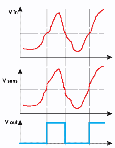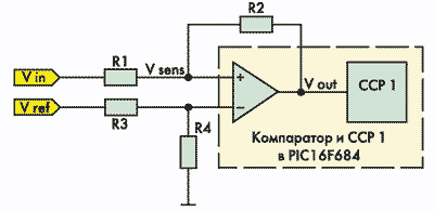 Микроконтроллер со встроенным аналоговым компаратором и модулем CCP или ЕССР может быть легко использован для измерения периода аналогового сигнала. На рис. 8 приведен пример схемы с использованием периферийных модулей контроллера PIC16F684. Резисторы R3 и R4 задают порог срабатывания компаратора. При пересечении входным сигналом уровня порога, выходной уровень напряжения компаратора переключается между 0 и 1. Резисторы R1 и R2 задают гистерезис для предотвращения "дребезга" при равенстве порогового и входного напряжений. Рис. 9 демонстрирует эффект гистерезиса.