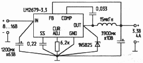 На рис.5а приведена схема стабилизатора с Vo = 3,3 В и максимальным выходным током IO MAX = 4 А. Соединение элементов с "землей" в одной точке является предпосылкой стабильной работы без самовозбуждения, которое может возникнуть из-за паразитной индуктивности монтажа. Для этой же цели служит и конденсатор 0,033 мкФ. Конденсатор 0,22 мкФ определяет медленный старт. Нормальная величина Vo достигается через 50 мс после подачи входного напряжения. При помощи резистора сопротивлением 6,2 кОм осуществляется ограничение выходного тока величиной не более 6 А.