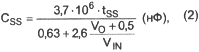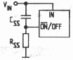 Разновидностью медленного старта является вариант, когда требуемая величина выходного напряжения Vo достигается по истечении времени tSS с момента включения VIN. В этом случае используется схема, приведенная на рис.2. В момент подачи напряжения VIN конденсатор не заряжен, и на вход ON/OFF поступает VIN (т.е. уровень логической "1"), который обеспечивает Vo = 0. За время tSS напряжение на этом входе уменьшается до уровня логического "0", благодаря чему на выходе ИС устанавливается нормальная величина VO. Для задания tSS используется формула