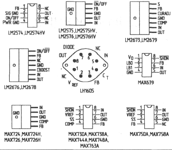 В таблице приведены основные параметры некоторых ПнП двух крупнейших мировых производителей. Первые 8 из них используются в уже рассмотренных вариантах схем источников питания с фиксированным или задаваемым с помощью внешних резисторов Vo в соответствии со схемой, приведенной на рис.Зб, и формулой (2) в [1]. Исключение составляет LH1605, в котором резистор R1=2 кОм встроен в ИС. Все ИС работают с ШИМ (ТШИМ), что отмечается в первой колонке. Исключением является МАХ639, работающая с ЧИМ. Расположение выводов ИС, приведенных в таблице, дано на рис.1. Выводы NC — не подключены.