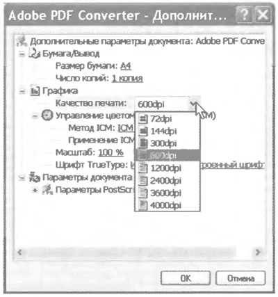 В окне Adobe PDF Настройки печати проверяем наличие флагов View Adobe PDF results (автоматический просмотр созданного PDF-файла по окончании печати) и Prompt for Adobe PDF filename (запрос имени файла печати). Затем выбираем закладку Расположение и кнопку Дополнительно..., после чего становятся доступными для изменения дополнительные параметры документа PDF. В пункте Графика также устанавливаем качество печати 600 dpi и нажимаем на кнопку ОК (рис. 3). Нажатием на кнопку Применить подтверждаем сделанные изменения в окне Настройки печати и закрываем его.