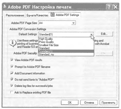 Adobe Acrobat 6.0 Standard совместим с версиями Windows 9x/2K/XP После установки пакета в обычной конфигурации в системе появляется принтер Adobe PDF. Перед использованием принтер необходимо настроить. Заходим в Панель управления - Принтеры и факсы, щелкаем правой кнопкой мыши на значке принтера Adobe PDF и в ниспадающем меню выбираем пункт Настройка печати... Окно настроек открывается на закладке Adobe PDF Settings. В области настроек Adobe PDF Conversion Settings в строке Default Settings (настройки по умолчанию) следует выбрать набор установок Standard (1), после чего входим в режим его редактирования, нажав на кнопку Edit (рис. 1).