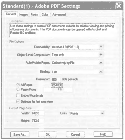 В новом окне в области File Options (свойства файла) проверяем совместимость с ранними версиями стандарта PDF - в строке Compability желательно оставить настройку по умолчанию: Acrobat 4.0 (PDF 1.3). В строке Resolution следует изменить значение разрешения на 600 dpi (рис. 2). Остальные параметры можно оставить по умолчанию, а внесенные изменения сохранить, нажав на кнопку Save As... и введя новое имя файла настроек, например, Standard my.joboptions. Строку Adobe PDF Security оставляем без изменений, поскольку рассмотрение параметров безопасности документов PDF - это, скорее, тема для отдельной статьи.