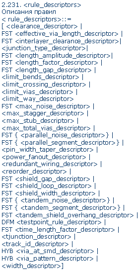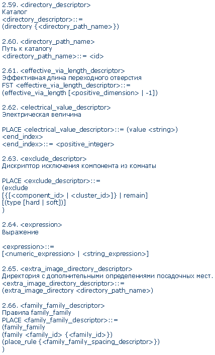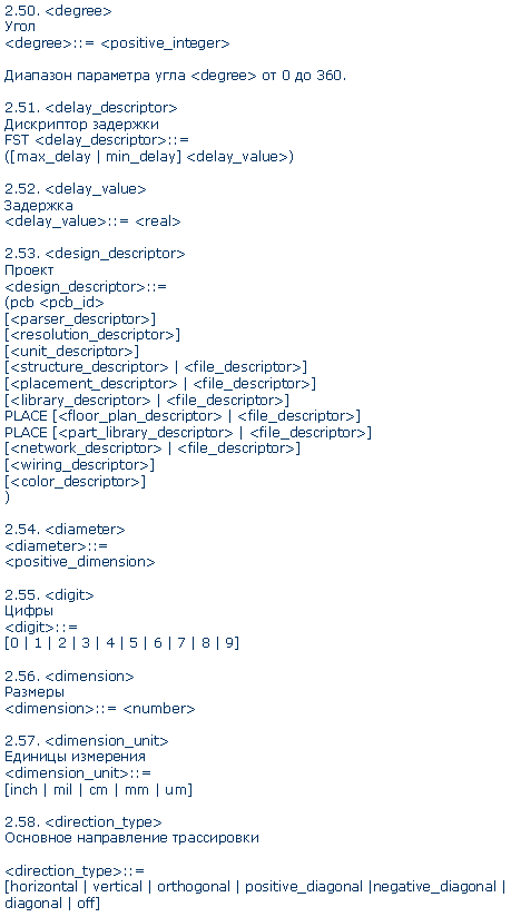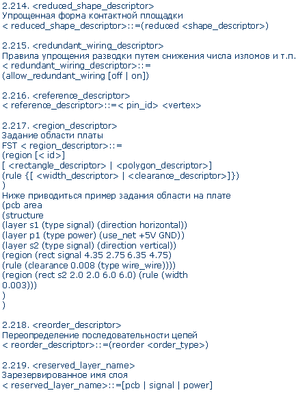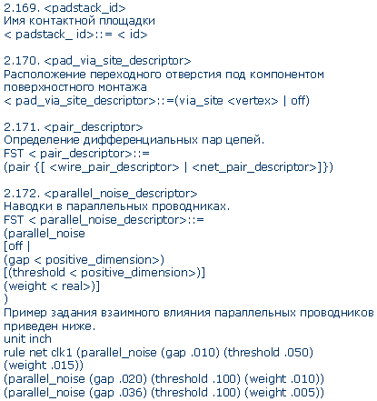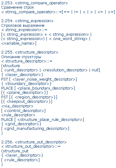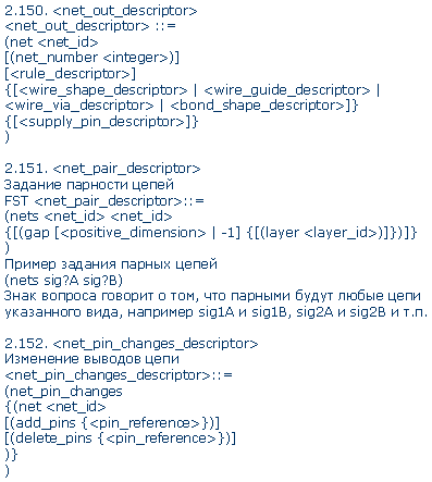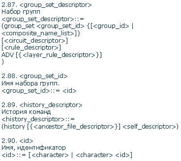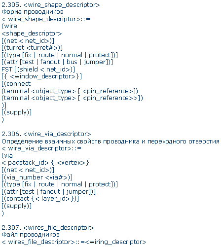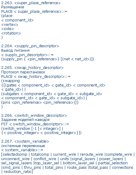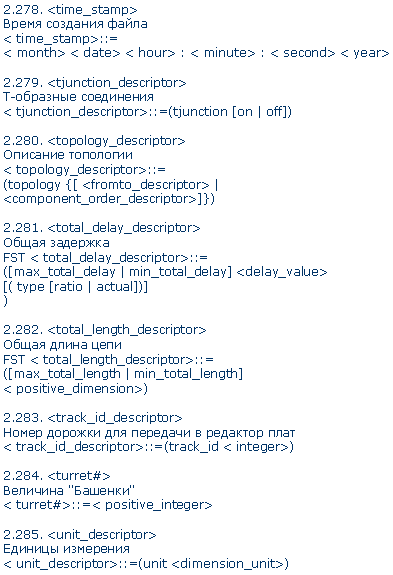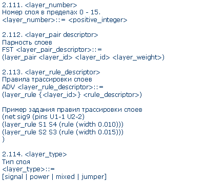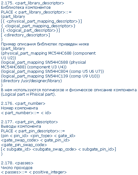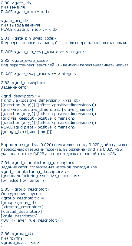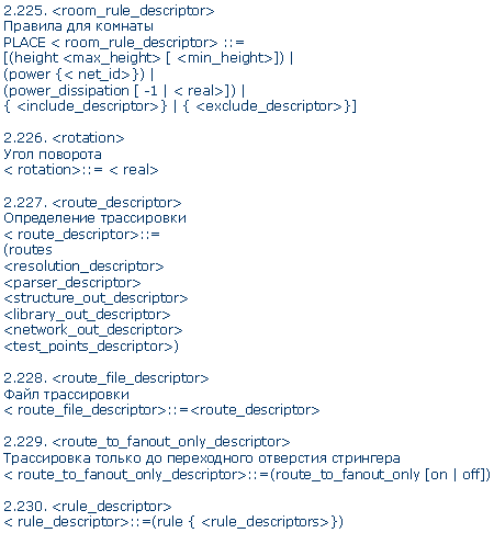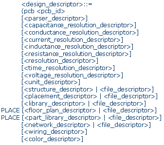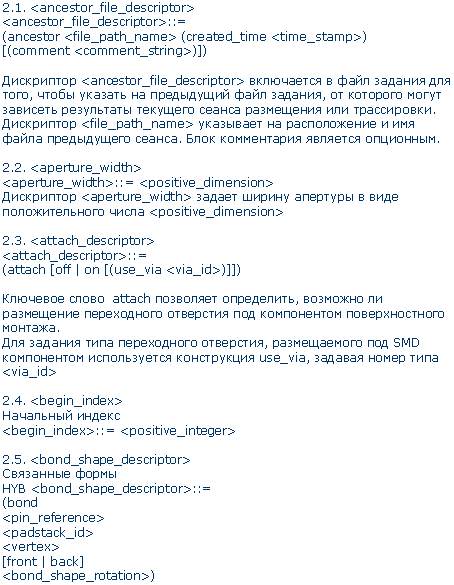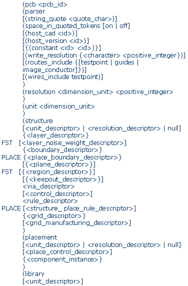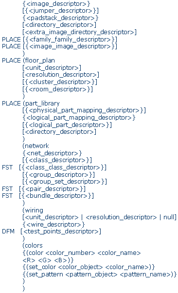 Как видим, самым верхним уровнем иерархии является печатная плата.Иерархическая организация позволяет определить правила размещения и трассировки с высокой степенью детальности с одной стороны, не теряя общих для всего проекта установок.При описании языка используются соглашения нормальной формы Бэкус-Науэра, знак ::= обозначает "определен как", дискрипторы, представляющие собой алфавитные, числовые, или алфавитно-цифровые символьные строки, типа дискрипторов значения, имени файла обозначаются в угловых скобках <>. Фигурные скобки {} указывают, что заключенный в них объект может быть использован несколько раз. Круглые скобки используют для обязательного набора объектов. Квадратные скобки [] используют для обозначения возможного (опционного) множества объектов. Вертикальная черта  | - выбор по "ИЛИ".Структура файла задания (Do-файла) приведена ниже. Минимально должны быть включены в файл пять секций: pcb, structure, placement, library, network. Все остальные секции являются необязательными.