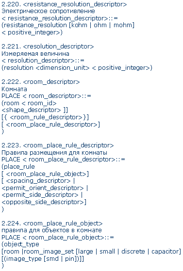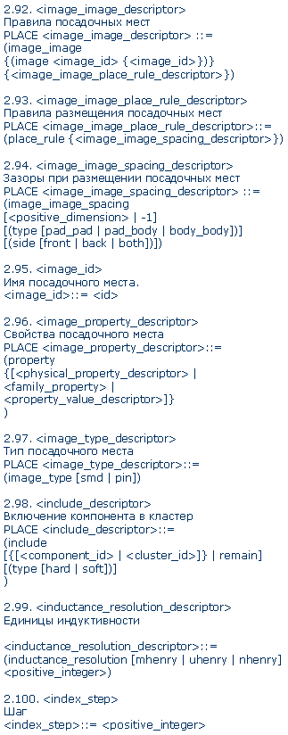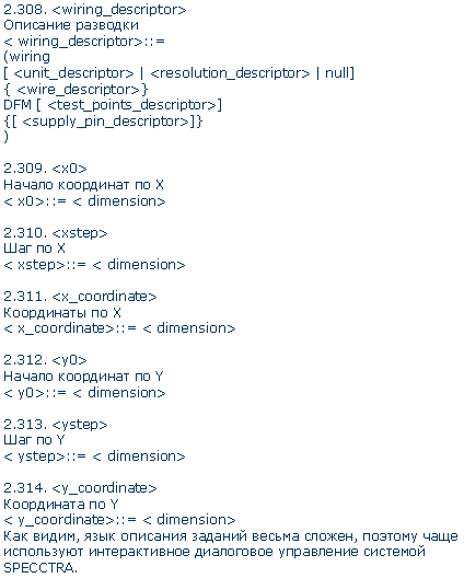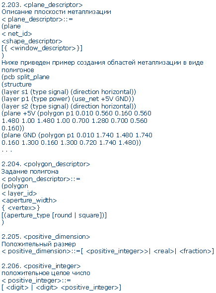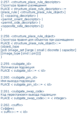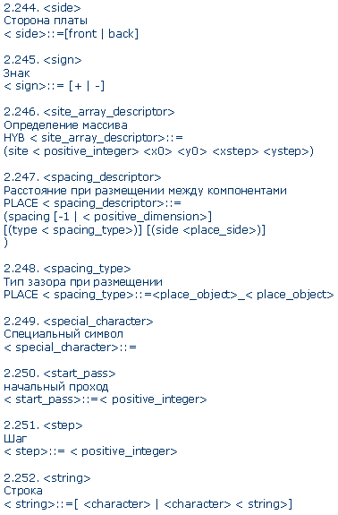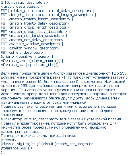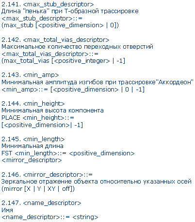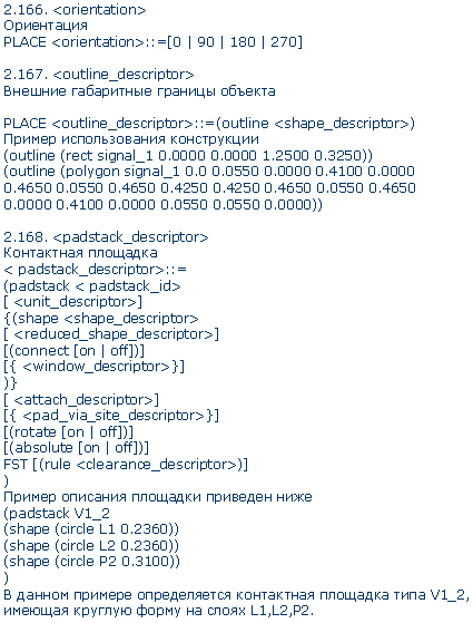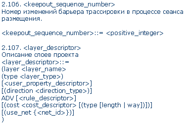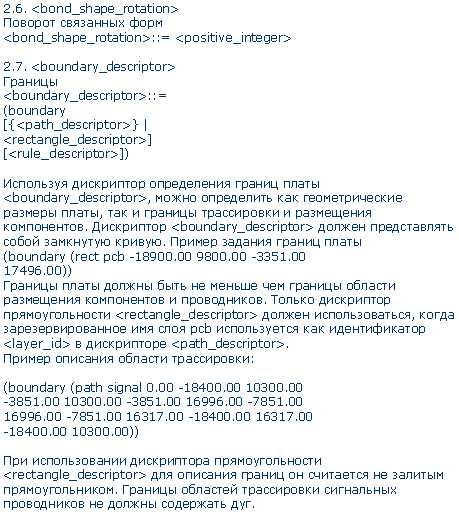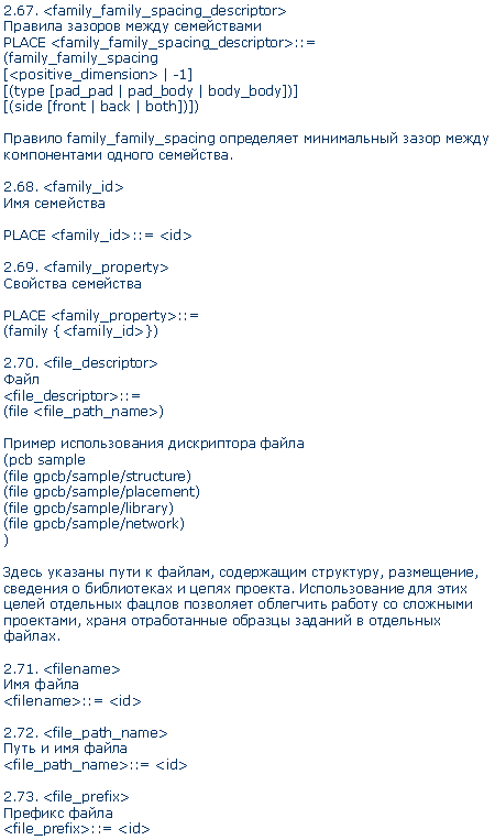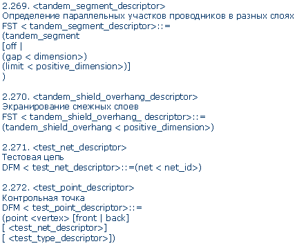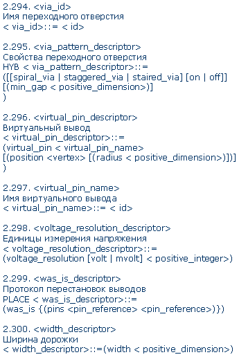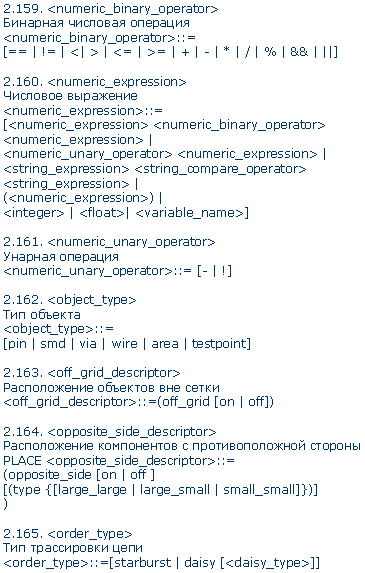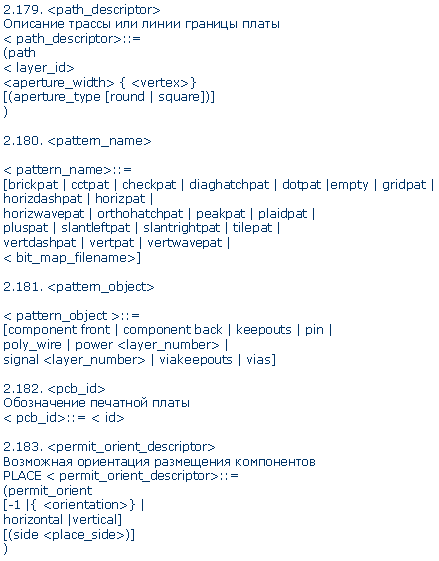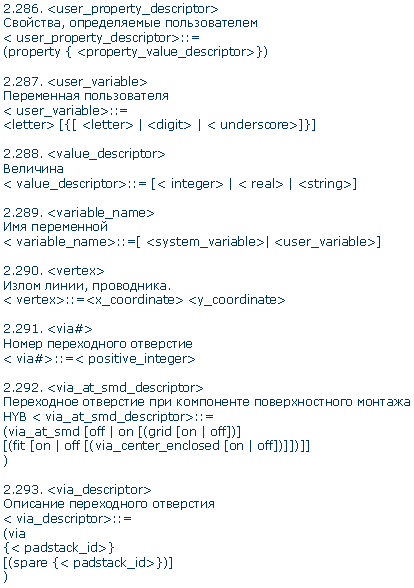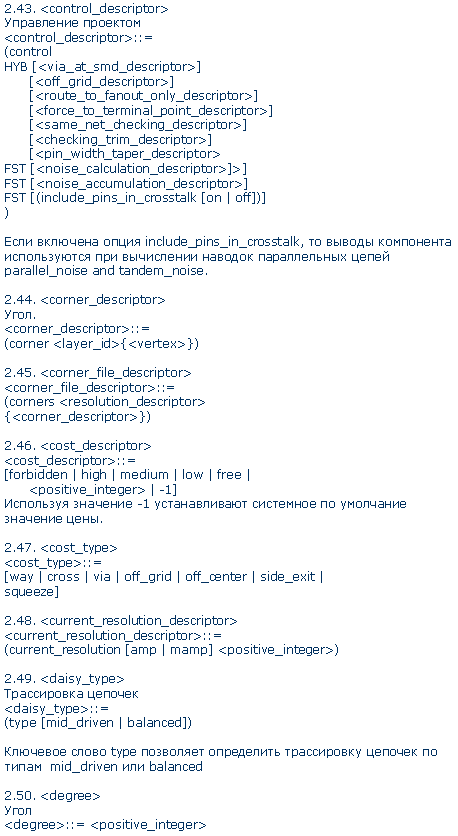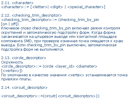 Как видим, самым верхним уровнем иерархии является печатная плата.Иерархическая организация позволяет определить правила размещения и трассировки с высокой степенью детальности с одной стороны, не теряя общих для всего проекта установок.При описании языка используются соглашения нормальной формы Бэкус-Науэра, знак ::= обозначает "определен как", дискрипторы, представляющие собой алфавитные, числовые, или алфавитно-цифровые символьные строки, типа дискрипторов значения, имени файла обозначаются в угловых скобках <>. Фигурные скобки {} указывают, что заключенный в них объект может быть использован несколько раз. Круглые скобки используют для обязательного набора объектов. Квадратные скобки [] используют для обозначения возможного (опционного) множества объектов. Вертикальная черта  | - выбор по "ИЛИ".Структура файла задания (Do-файла) приведена ниже. Минимально должны быть включены в файл пять секций: pcb, structure, placement, library, network. Все остальные секции являются необязательными.
