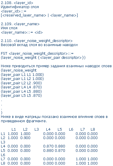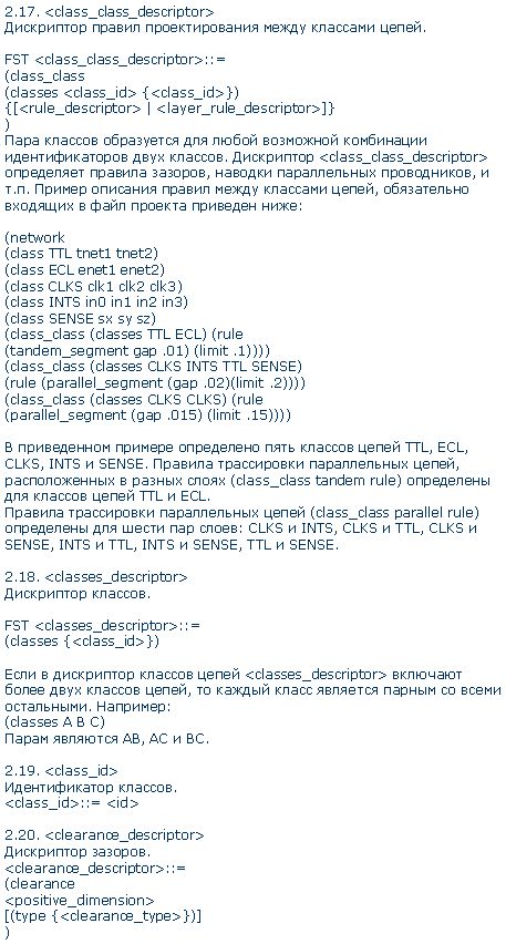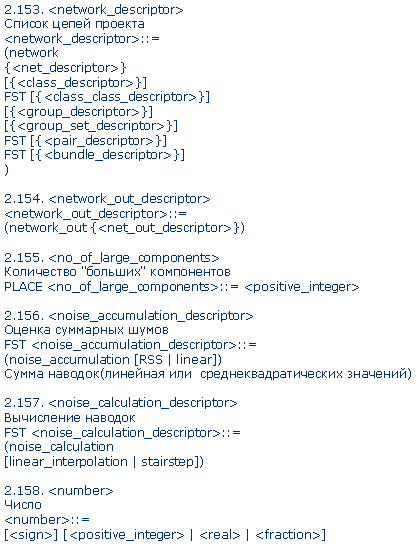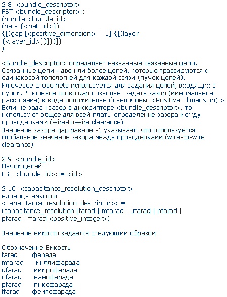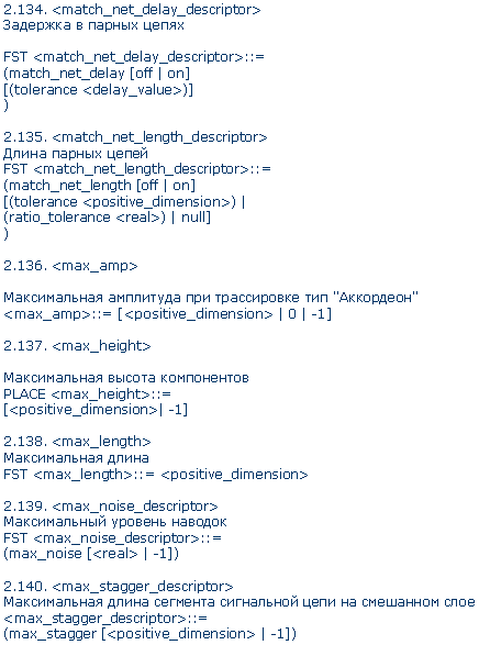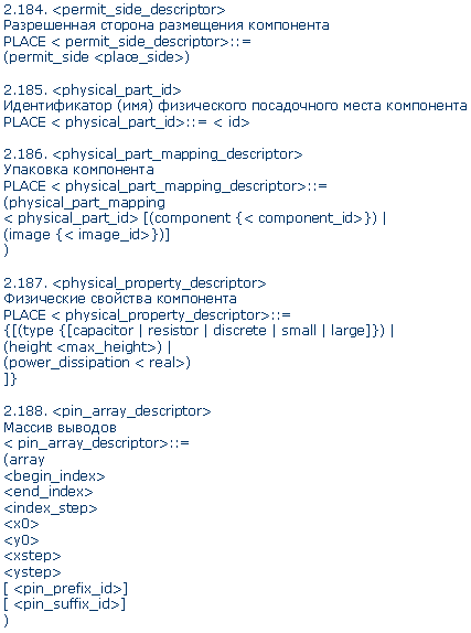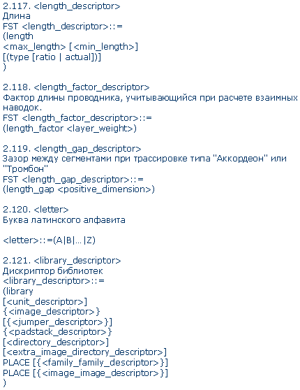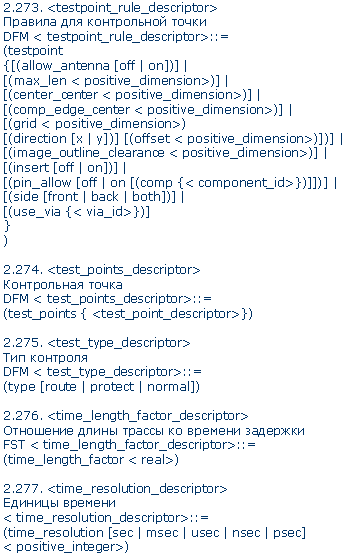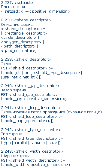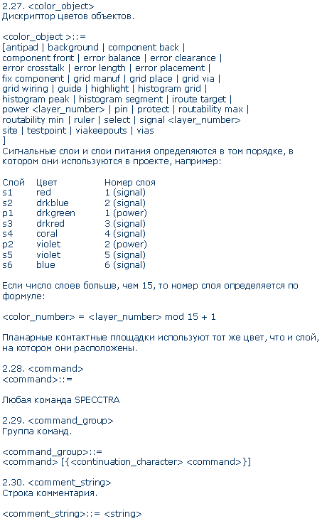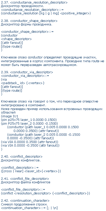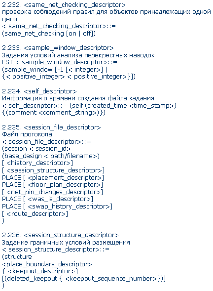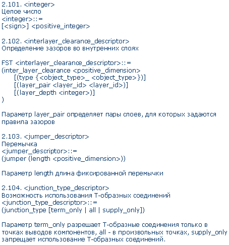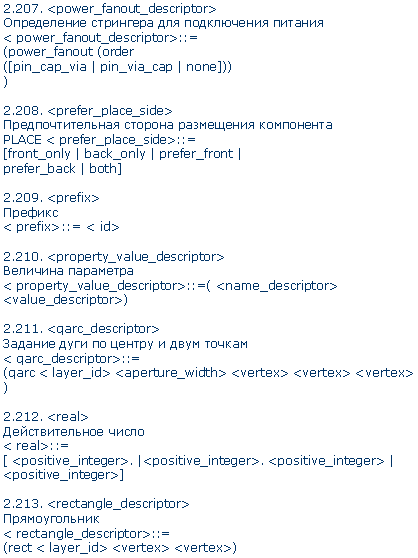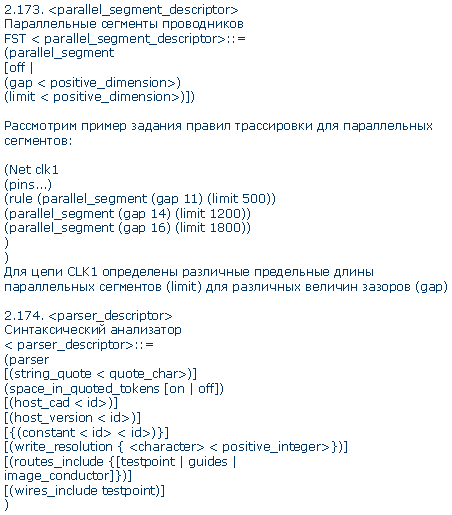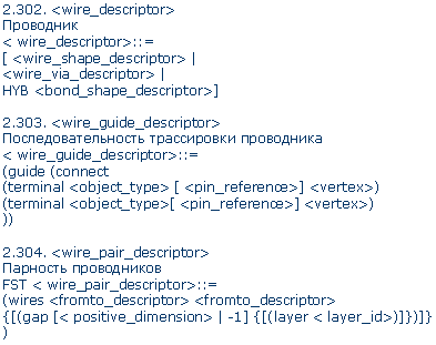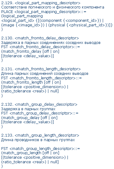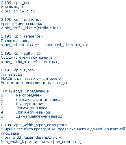 Как видим, самым верхним уровнем иерархии является печатная плата.Иерархическая организация позволяет определить правила размещения и трассировки с высокой степенью детальности с одной стороны, не теряя общих для всего проекта установок.При описании языка используются соглашения нормальной формы Бэкус-Науэра, знак ::= обозначает "определен как", дискрипторы, представляющие собой алфавитные, числовые, или алфавитно-цифровые символьные строки, типа дискрипторов значения, имени файла обозначаются в угловых скобках <>. Фигурные скобки {} указывают, что заключенный в них объект может быть использован несколько раз. Круглые скобки используют для обязательного набора объектов. Квадратные скобки [] используют для обозначения возможного (опционного) множества объектов. Вертикальная черта  | - выбор по "ИЛИ".Структура файла задания (Do-файла) приведена ниже. Минимально должны быть включены в файл пять секций: pcb, structure, placement, library, network. Все остальные секции являются необязательными.