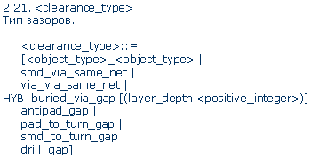 Правило antipad_gap позволяет задать зазоры между вырезами во внутренних слоях металлизации и металлизированным отверстием. Пример определения этого правила:(pcb...(structure...(rule (clearance 0.2 (type antipad_gap)))...))