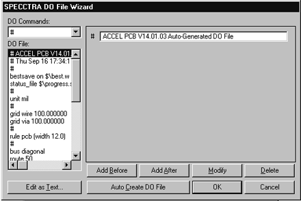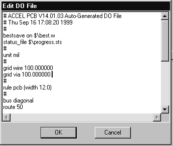 Особенностью системы SPECCTRA является необходимость составления задания на автоматическое размещение и трассировку с помощью специального управляющего файла, т.н. Do- файла. Следует заметить, написание Do- файла весьма сложный и муторный процесс, который в некоторой степени облегчается наличием в меню Route/Autorouters (Place/ Autoplacement) P-CAD PCB мастера создания управляющего файла Do wizard. Группа кнопок Do File (рис. 1) предназначена для создания и редактирования управляющего файла системы SPECCTRA. Для ручного редактирования Do- файла предназначена кнопка Edit as text, вызывающее окно текстового редактора, показанное на рис. 2.