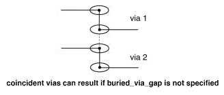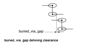 Правило buried_via_gap определяет зазор между глухими межслойными переходными отверстиями. Зазор buried_via_gap может быть определен в файле проекта с использованием правил определения зазоров. Кроме того, правило buried_via_gap может быть определено в файле задания (do-файле) или с использованием среды программы SPECCTRA.Использование правила позволяет предотвратить появление соосных глухих переходных отверстий,, так, как это показано на рис. 6.