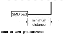 Правило smd_to_turn_gap определяет минимальное расстояние между поверхностной контактной площадкой и первым изломом проводника(рис.10)