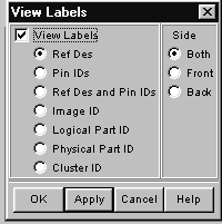 В этом меню можно задать основные правила авторазмещения компонентов., такие как сетка и зазор при размещеннии, скорость размещения, точки привязки при выравнивании, ориентация и т.п.Затем производят предварительное размещение компонентов, имеющих жесткую привязку, таких как соединители, ралиаторы и т.п.Для того, чтобы видеть позиционные обозначения таких компонентов используют команду View/ Labels. Меню этой команды приведено на рис. 19.