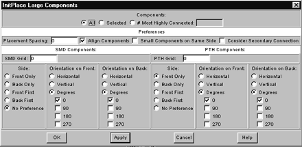 При выполненииразмещения компонентов нобходимо выполнить следующие основные действия- установить правила размещения;- разместить критичные компоненты, привязанные к конкретному местту платы;- разместить большие компоненты (Large);- разместить "маленькие" компоненты (Small).