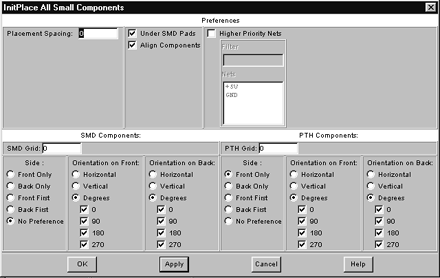 С помощью этих команд выполняют размещение, а затем перестановку выбранных компонентов с заданными условиями ориентации, положения и т.д.Задание областей запрета трассировки производят с помощью команды Define/Keepout.Размещение малых компонентов выполняется связанно с большими компонентами, причем система SPECCTRA "обучается" способам размещения. Для этого вручную размещабт фильтрующую емкость как можно ближе к выводам питания, которые можно увидеть с помощью команды View/Label. Затем выделяют микросхему и конденсатор и применяют команду Autoplace / Small Comp Pattern / Learn. Затем выделяют несколько микросхем и применяют команду Autoplace / Small Comp Pattern / Apply to Selected.Кроме того, команда Autoplace / InitPlace Small Components позволяет выполнить полностью автоматическое размещение малых компонентов. Меню этой команды при размещении всех малых компонентов приведено на рис. 23.
