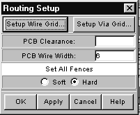 Как уже отмечалось, возможности бессеточной технологии позволяют задать детальные правила для трассировки практически всех типов компонентов с учетом большого числа ограничений.Поскольку все объекты на плате имеют определенный уровень иерархии, то возможно задание раздельных правил трассировки одной и той же цепи для разных объектов, тем самым есть возможность трассировки одной цепи сегментами разной ширины.Правила трассировки могут задаваться с помощью языка описания заданий, либо с использованием интерактивных диалоговых команд меню Rules.Собственно автотрассировка выполняется с использованием команд меню Autoroute. Предварительное задание параметров трассировки осуществляют по команде Autoroute / Setup, меню которой приведено на рис.25.