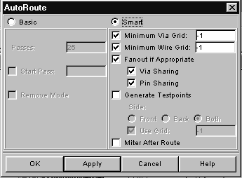 В этом меню задается число проходов трассировки, необходимость генерации контрольных точек, работа со стрингерами, сетки переходных отверстий и трассировки, сглаживание углов.Удаление избыточных изломов и переходных отверстий после завершения трассировки выполняют с помощью команды Autoroute /Clean.Оптимизацию трассировки и улучшение внешнего вида и технологичности платы производится чс помощью команд меню Autoroute/Post Route. С помощью этихъ команд возможно удалить лишние изгибы проводников без их разрыва (Critic), Удалить проводники для ликвидации конфликтов (Filter Routing), создать контрольные точки (Testpoints), а также выполнить симметрирование сегментов, раздвинуть проводники при наличии свободного места и т.п.