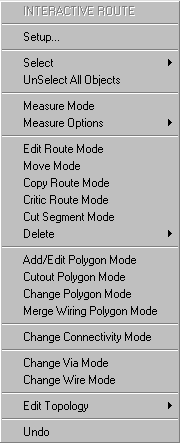 Предварительное разбиение сегментов с добавлением переходного отверстия производится с помощью команды Autoroute/ Pre Route/ Seed Vias, размещение перемычек и навесных проводников - командой Autoroute /Pre Route/Wirebonds.Трассировка основной массы цепей выполняется с помощью команды Autoroute/Route.  На рис. 28 приведено меню этой команды.