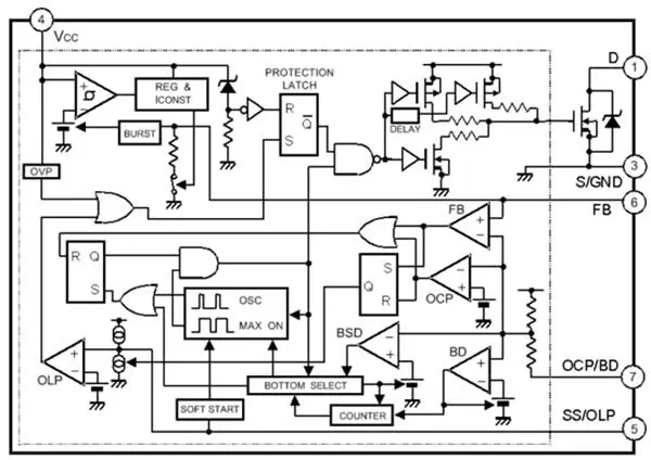 - Есть несколько вариантов встроенной защиты, в том числе: гарантия отсутствия лавинного эффекта для MOSFET, циклическое ограничение тока, блокировка пониженного напряжения с гистерезисом и защита от перенапряжения (защищает источник питания во время перегрузки или неисправности).