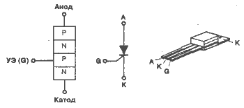 Тиристор имеет три вывода, один из которых - управляющий электрод, можно сказать, "спусковой крючок" - используется для резкого перевода тиристора во включенное состояние.