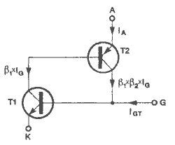 Так как ток IGT становится базовым током транзистора n-p-n, то ток коллектора этого транзистора равен B1xIGT, где B1 - коэффициент усиления по току транзистора Т1.