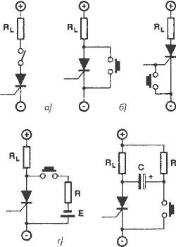Включенный параллельно основным электродам тиристора (рис. 6б) ключ шунтирует анодный ток, и тиристор при этом переходит в закрытое состояние. Некоторые тиристоры повторно включаются после размыкания ключа. Это объясняется тем, что при размыкании ключа заряжается паразитная емкость р-n перехода тиристора, вызывая помехи.