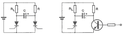 На рис. 6а-д представлены различные варианты схем отключения тиристора, среди них и ранее упоминавшиеся. Другие, как правило, применяются, когда требуется отключать тиристор с помощью дополнительной цепи. В этих случаях механический выключатель можно заменить вспомогательным тиристором или ключевым транзистором, как показано на рис. 7.