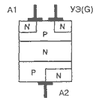 Симистор можно представить двумя тиристорами, включенными встречно-параллельно. Он пропускает ток в обоих направлениях. Структура этого полупроводникового прибора показана на рис. 8. Симистор имеет три электрода: один управляющий и два основных для пропускания рабочего тока.