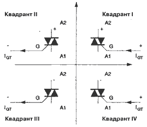 Каждый квадрант соответствует одному способу открывания симистора. Все способы кратко описаны в табл. 1.