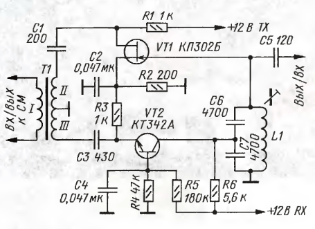 Двунаправленный усилительный каскад, в котором эта проблема сведена к минимуму, показан на рисунке. Он выполнен на полевом транзисторе КП302Б и биполярном транзисторе КТ342А. В режиме приема на резисторы R5, R6 подают напряжение +12 В. В этом случае сигнал проходит слева направо - работает транзистор VT2, включенный по схеме с общей базой. Обмотка I трансформатора Т1 подключается к диодному балансному смесителю. Подбором конденсатора СЗ и числа витков обмотки III трансформатора Т1 можно оптимально согласовать выходное сопротивление смесителя с входным усилительного каскада. Нагрузка каскада - контур C6C7L1. Подбором этих конденсаторов производят согласование выходного сопротивления усилителя с нагрузочным контуром. Результирующая емкость конденсаторов С6 и С7 при этом должна оставаться около 2300 пФ (контур настроен на частоту 500 кГц). Согласование сопротивления контура с последующими каскадами можно осуществить с помощью отвода от катушки L1.