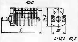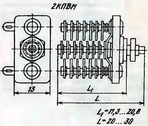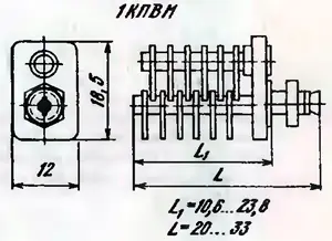 1КПВМ-8 1КПВМ-9 1КПВМ-10 1КПВМ-11 1КЛВМ-12 1КПВМ-13 1КПВМ-14 | Подстроечные с воздушным диэлектриком малогабаритные. Каждый тип конденсаторов по номинальному значению емкости, электрической прочности изоляции и покрытию секции ротора и статора разделяется на 14 видов. -60...+155 ºС | Покрытие секций ротора и статора - хим никелирование | ![]() | |||