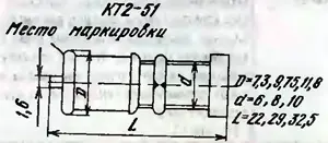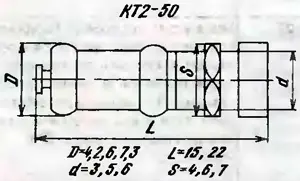 КТ2-51 | Подстроенный с воздушным диэлектриком. Предназначены для работы в качестве подстроечных элементов внутреннего монтажа в аппаратуре в цепях постоянного и переменного токов и в импульсных режимах -60...+125 ºС | 2,0...50 пФ 0,5...6,0 пФ 2,0...50 пФ | 50 500 500 | ±10 ±10 ±10 | 30±50 30±50 30±50 | ![]() |