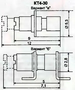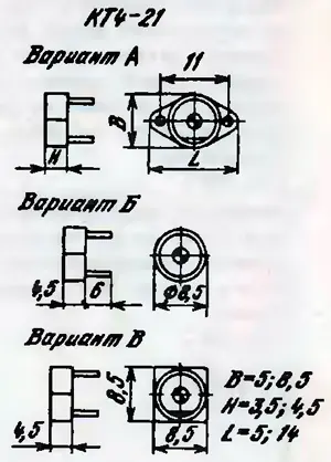 КТ4-21 | Керамическим подстроенные. Выпускаются в конструктивном варианте для печатных схем с креплением за корпус (вариант "а") и с креплением лайкой за выводы (варианты “б", “в"). Предназначены для работы в целях постоянного, переменного и импульсного токов. -60...+85 ºС | 1...5 пФ 2...10 пФ 3...15 пФ 4...20 пФ | 250 250 250 250 | ±10 ±10 ±10 ±10 | -(100...+200) -(100...+200) -(100...+200) -(100...+200) | ![]() |