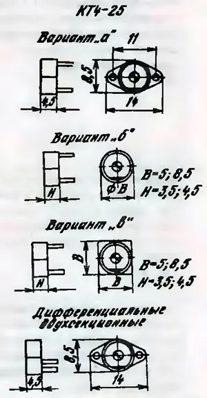 KT4-25 | Керамические подстроенные. Выпускаются в конструктивных вариантах: КТ4-25 "б” - для печатных схем с креплением пайкой за выводы (вариант "б"); КТ4-25 "в" - для печатных схем с креплением за корпус (варианты "а" и "в") и КТ4-25-2x1/5 - дифференциальные, двухсекционные. Предназначены для работы в цепях постоянного, переменного и импульсного токов. -60...+85 ºС | 1...5 пФ 2...10 пФ 3...15 пФ 5...25 пФ 6...30 пФ 0,4...2 пФ 0,4...2 пФ 1...5 пФ 2...10 пФ 3...15 пФ 0,4...2 пФ 1...5 пФ 2...10 пФ 3...15 пФ 4...20 пФ 2...10 пФ 3...15 пФ 4...20 пФ 4...20 пФ 5...25 пФ 6...30 пФ 8...40 пФ | 100 100 100 100 100 100 250 250 250 250 250 250 250 250 250 250 250 250 250 250 250 250 250 | ±10 ±10 ±10 ±10 ±10 ±10 ±10 ±10 ±10 ±10 ±10 ±10 ±10 ±10 ±10 ±10 ±10 ±10 ±10 ±10 ±10 ±10 ±10 | МПО МПО МПО М750 М750 М750 М100 МПО МПО МПО МПО М75 М75 М75 М75 М470 М470 М470 М470 М750 М750 М750 М750 | ![]() |