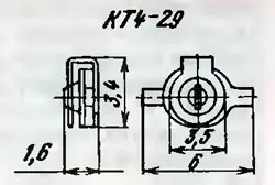КТ4-29 | Керамические подстроенные. Выпускаются в конструктивном “эриант" для интегральных микросхем и печатных схем с креплением пайкой за луженые контакты площадки. Предназначены для работы в цепях переменного, постстоянного и импульсного токов. -60...+60 ºС | 5...25 пФ | 25 | ±10 | М750 | ![]() |