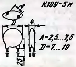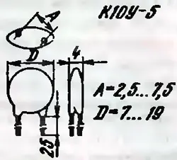 К10У-5 | Керамические неизолированные с барьерным слоем на полупроводниковой основе. Предназначены для работы в цепях постоянного, переменного и пульсирующего токов и в импульсных режимах. -60...+85 ºС | 0,1...2,2 0,01...0,47 0,0068...0,22 | 3,2 10 25 | +80...-20 +80...-20 +80...-20 | Н50 Н50 Н50 | ![]() |