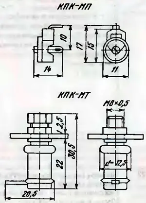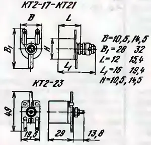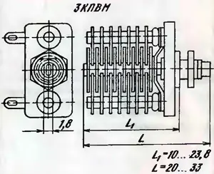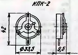 КТ2-17 КТ2-18 КТ2-19 КТ2-20 КТ2-21 КТ2-23 | Подстроенный с воздушным диэлектриком. Предназначены для работы в радиоаппаратуре. -60.. +125 ºС Для КТ2-23 - -60...+85 ºС | 1,5...5 пФ 1,5...10 пФ 1,9...15 пФ 2,5...30 пФ 3,0...50 пФ 6,0...50 пФ | 160 160 160 160 160 160 | ±10 ±10 ±10 ±10 ±10 ±10 | +300 +300 +300 +300 +300 +300 | ![]() |