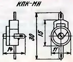 кпк-мп, кпк-мт | Керамические подстроечние. Выпускаются в вариантах: для монтажа на печатные платы (КПК-МТ) и с креплением пайкой за выводы (КПК-МП). Предназначены для работы в цепях постоянного, переменного и импульсного токов. -60...+85 ºС | 2...7 пФ 4...15 пФ 5...20 пФ 6...25 пФ 8...30 пФ | 350 350 350 350 350 | - - - - - | -600 -600 -600 -600 -600 | ![]() |