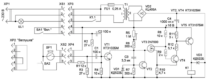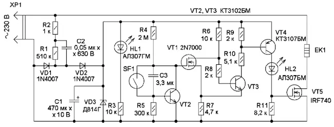 В исходном состоянии транзистор VT1 закрыт, конденсатор С3 заряжен, поэтому транзистор VT2 также закрыт, а полевой транзистор VT3 открыт, поэтому транзисторы VT4, VT5 закрыты, реле обесточено и на осветительную лампу EL1 напряжение сети не поступает.