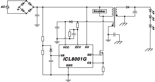 Микросхема компании Infineon позволяет строить на ее основе светодиодный балласт, совмещающий в одном каскаде корректор коэффициента мощности и обратноходовый преобразователь (в зарубежных источниках встречается как Single Stage Convertor with high cosф factor или BIFRED). Такая схемотехника давно известна, в управляющей части размещается PFC-контроллер (в данном случае CrCM), входная емкость переносится на вторичную сторону. Данная микросхема позволяет также реализовать диммируемый балласт, который может работать совместно с обычным фазовым симисторным диммером.