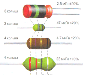 В соответствии с Публикацией IEC 62 для индуктивностей кодируется номинальное значение индуктивности и допуск, т.е. допускаемое отклонение от указанного номинала. Наиболее часто применяется кодировка 4 или 3 цветными кольцами или точками. Первые две метки указывают на значение номинальной индуктивности в микрогенри (мкГн), третья метка — множитель, четвертая — допуск. В случае кодирования 3 метками подразумевается допуск 20%. Цветное кольцо, обозначающее первую цифру номинала, может быть шире, чем все остальные.