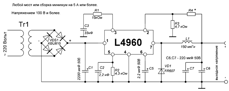 R4 отмечен звёздочкой потому, что его значение нужно подбирать в зависимости от требуемого выходного напряжения.