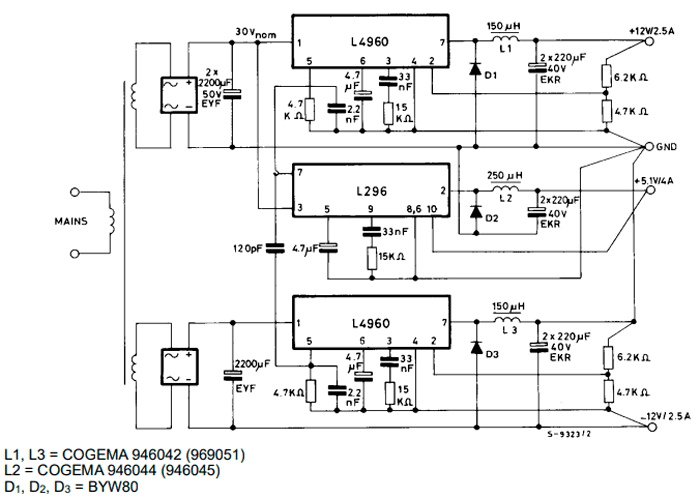 А это схема блока питания для микрокомпьютеров с несколькими уровнями напряжения (+ 5.1В, -5В, +12В и -12В). Потребуется еще одна микросхема – L295.