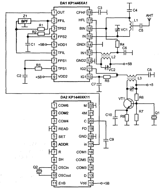 Микросхема КР1446ХА1 представляет собой конвертор радиочастоты (или приемник), а КР1446ХК11 - декодер. Они используются в цифровых приемниках управляющих сигналов, которые предназначены для беспроводного управления удаленными объектами от местной пейджинговой станции. Микросхема КР1446ХА1 обеспечивает усиление радиочастотного сигнала, преобразование в промежуточную частоту (ПЧ), усиление ПЧ, а КР1446ХК11 выполняет детектирование частотно-манипулированного сигнала, восстановление импульсов синхронизации из потока данных, аппаратное декодирование команд,переданных по протоколу пейджинговой связи POCSAG, хранение однократно программируемого адреса. Для расширения функциональных возможностей приемника к микросхеме декодера возможно подключение микроконтроллера.