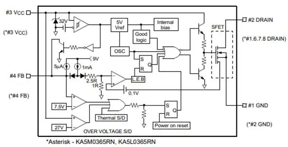 Понять логику работы и назначение контактов поможет блок-диаграмма микросхемы KA5L0380R (универсальная для всех микросхем в серии).
