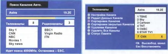 Список отсканированных каналов можно редактировать: изменить данные, название, удалить и т. д. (рис. 8). Для удобства пользователь может составить фаворитный список любимых каналов, ввести блокировку от детей. Звуковое сопровождение некоторых каналов происходит на нескольких языках. Поэтому в ресивере предусмотрена возможность выбора языка